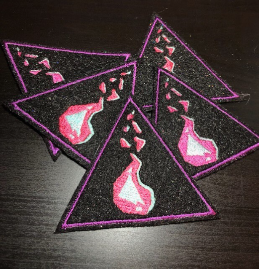 This Burnish inspired patch is 3.5" inches in height and in length. Embroidered on glittered stiff felt with iron on transfer on the back, but I still recommend stitching it down.