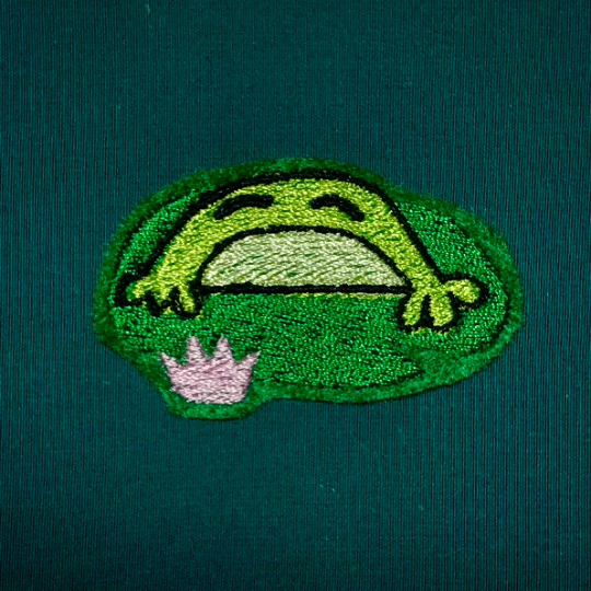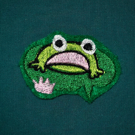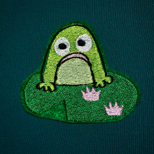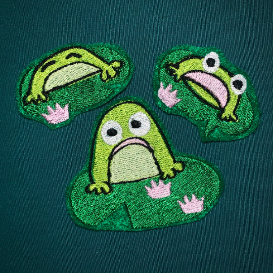 Choose from three emotionally distressed frogs or take home all three! Stitched on green felt with iron-on backing.