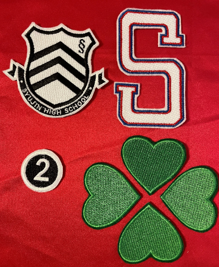 ☆ Ann Cosplay Set, comes with: S symbol ( 4.5" height x 2.6" width ), four leaf clover ( 2" height x 2.3" width per leaf ), and Shujin patch.